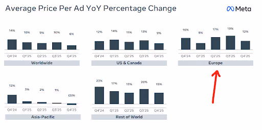 However, rising CPMs are only part of the challenge. Starting in Spring 2026, Meta is introducing “Location Fees”, additional surcharges on ads delivered in specific countries to offset local taxes, such as Digital Services Taxes (DST). How nice of them, we all get to pay Meta’s tax bill!