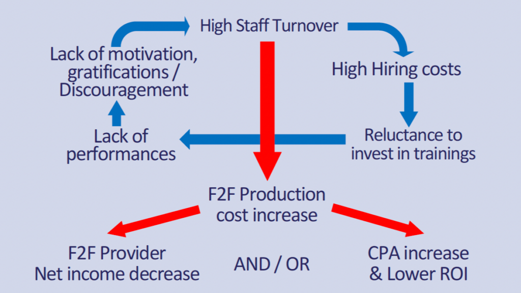 High staff turnover => higher hiring costs => reluctance to invest in training => weaker motivation and discourse quality => lower performance => higher CPA => increased pressure on ROI.